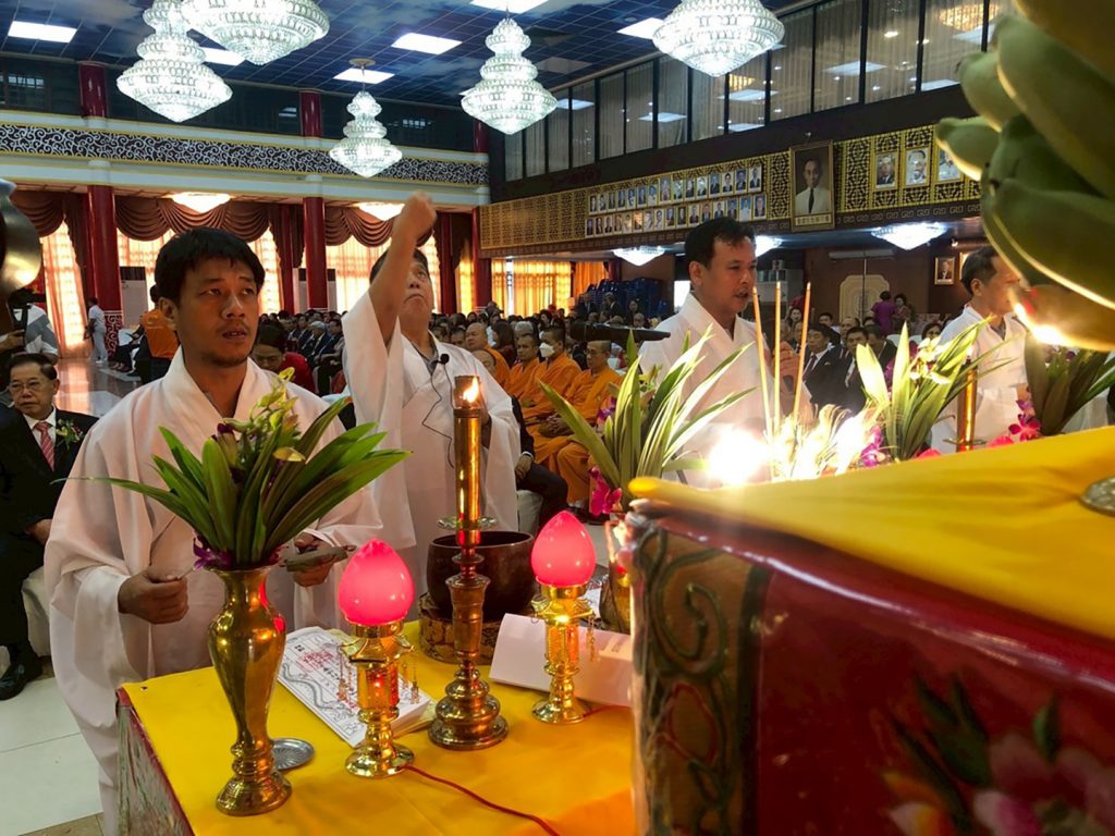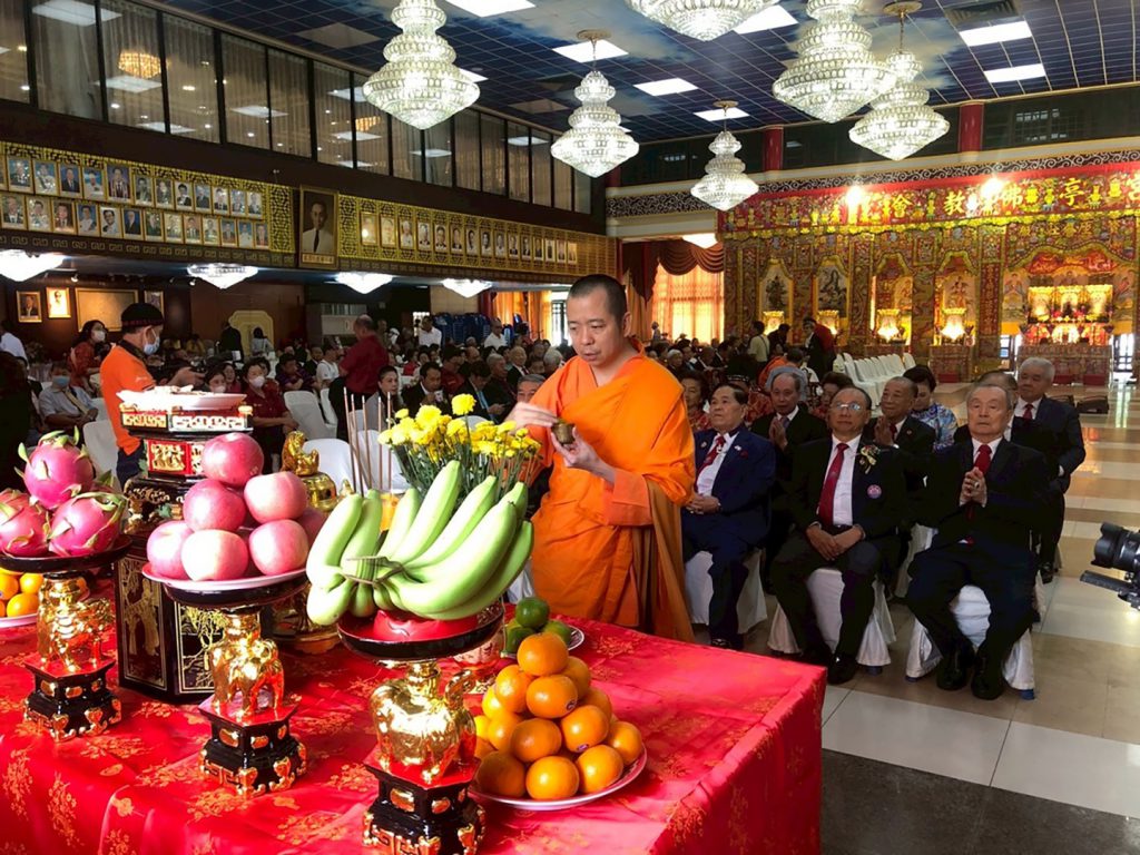 โดยมี นายสรกฤษณ์ ปิยมนูรังษี นายกกิตติมศักดิ์สมาคมนักธุรกิจสัมพันธ์แห่งประเทศไทย ถวายภัตตาหารเพล (เจ) แด่พระสงฆ์จีนซึ่งครั้งนี้ได้รับความเมตตาจากท่านพระคณาจารย์จีนธรรมวชิรานุวัตร (เย็นงี้) เจ้าอาวาสวัดมังกรกมลาวาส (วัดเล่งเน่ยยี่) เข้าร่วมในพิธี ก่อนที่ คณะโรงเจซำเป้าอัมพวา จะสาธยายพระสูตรพระอวโลกิเตศวร โพธิสัตว์ เสริมศิริมงคล พร้อมส่งเสด็จองค์สัมมาสัมพุทธเจ้าและสิ่งศักดิ์สิทธิ์ ปิดท้ายด้วย พิธีปิดกลอง เป็นอันเสร็จพิธีการ และรับประทานอาหารร่วมกัน (โต๊ะจีน) โดยพิธีการทั้งหมดได้เริ่มขึ้นตั้งแต่เวลา 8.20น. ถึงเวลา 15.30 น.